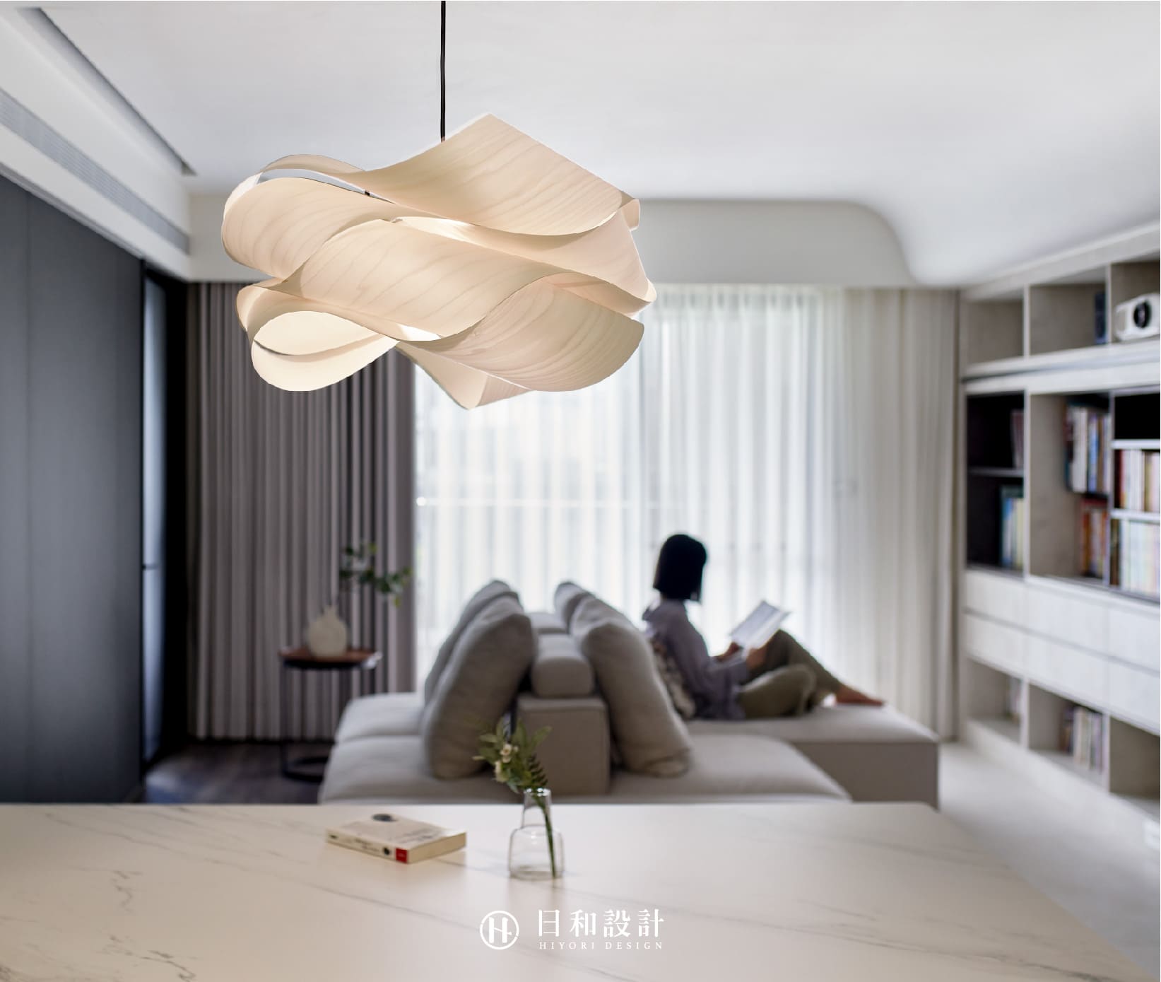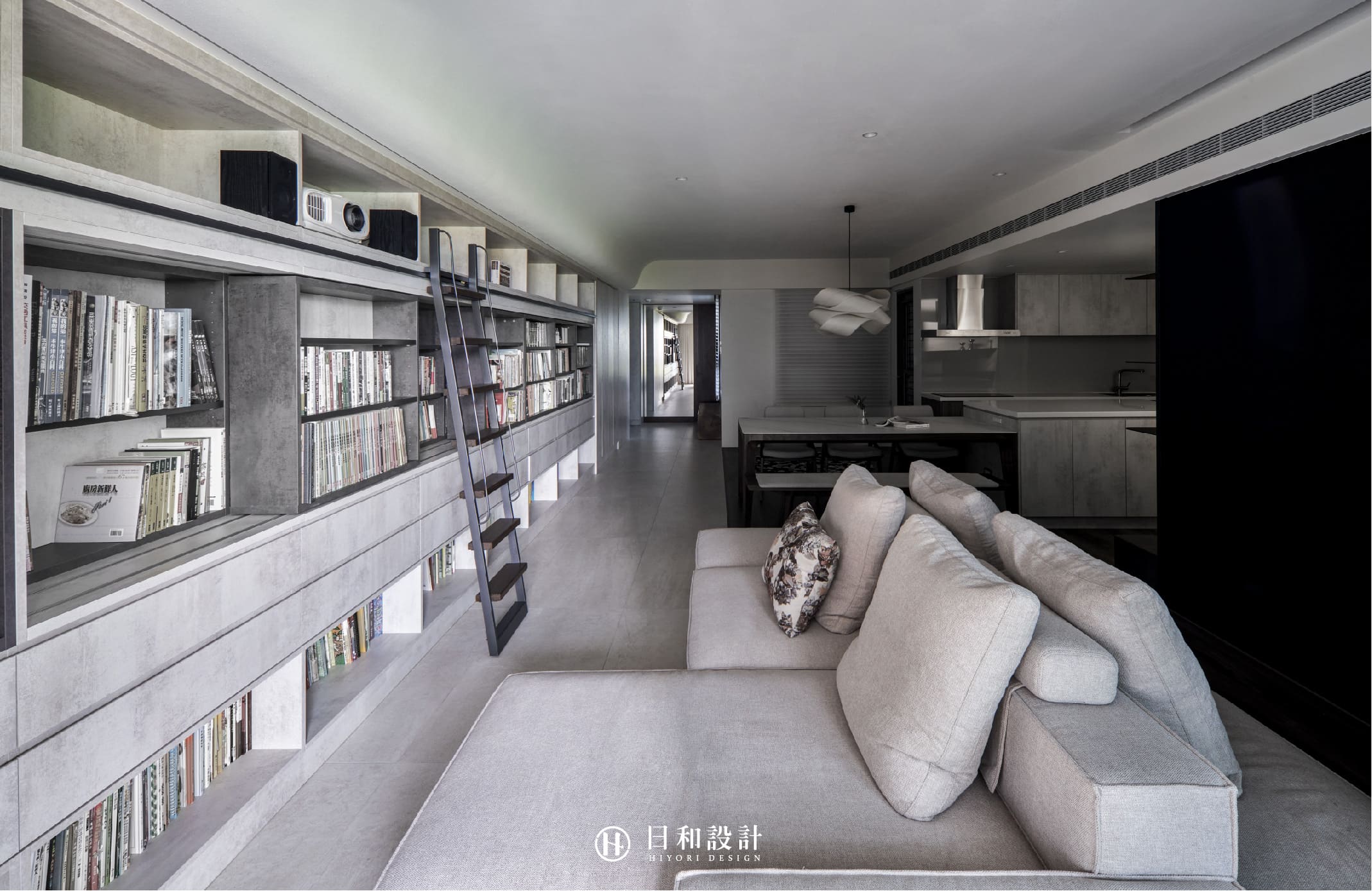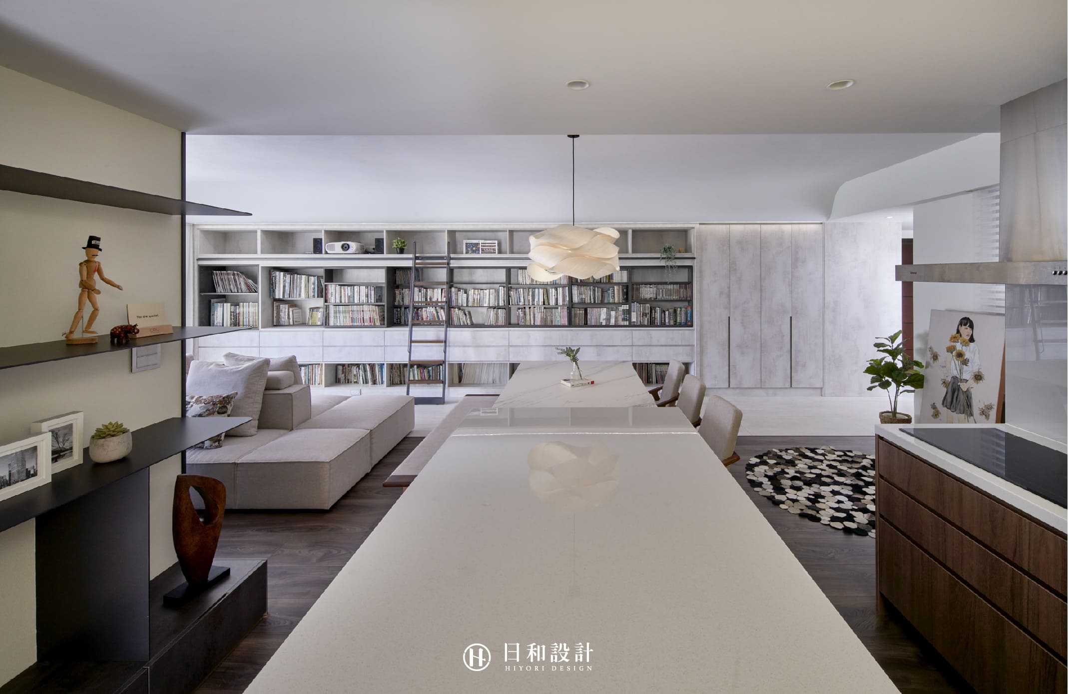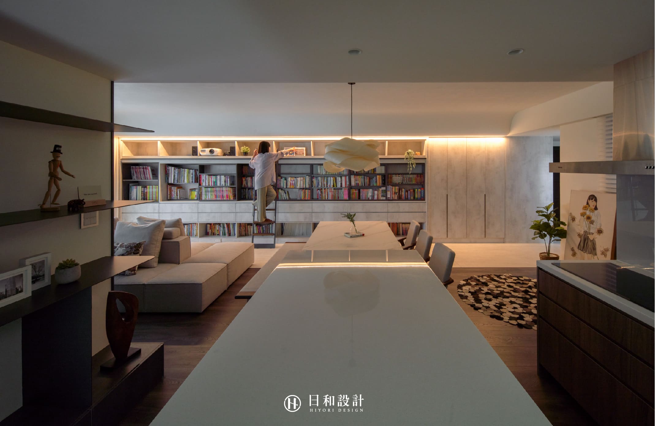 採用回字形動線設計,放置大型互動式沙發,讓家庭成員能夠聚在一塊,邊看書、邊談天。