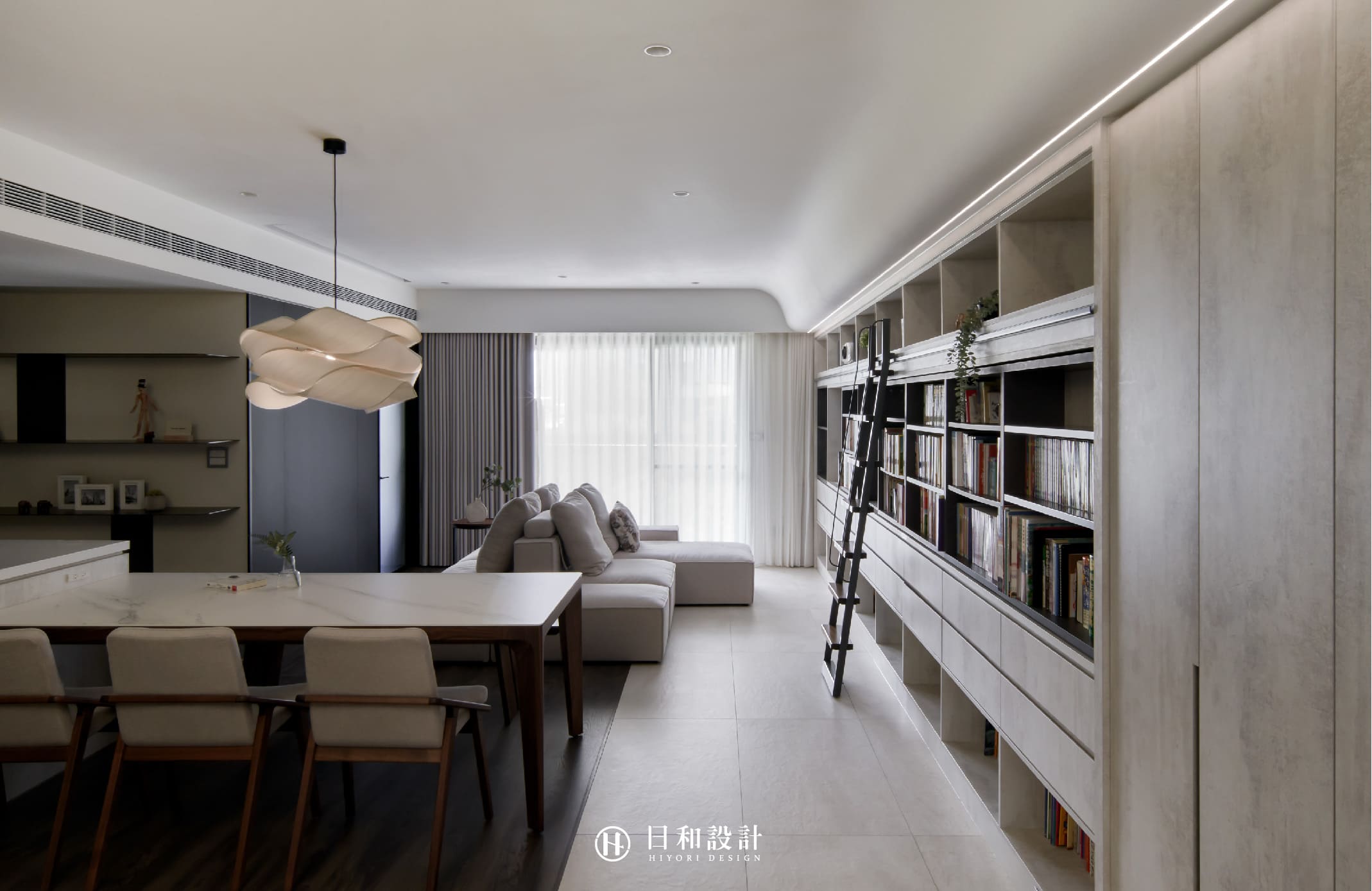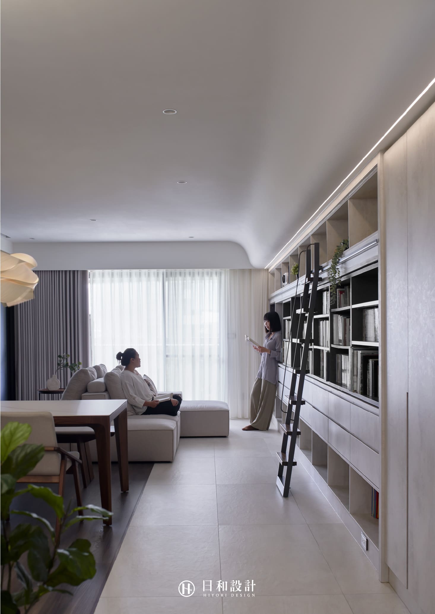 並將牆壁設計成雙層滑軌式書櫃,採機能式收納法,將成堆的書籍一一排列整齊,增加空間視覺寬敞、舒適度。