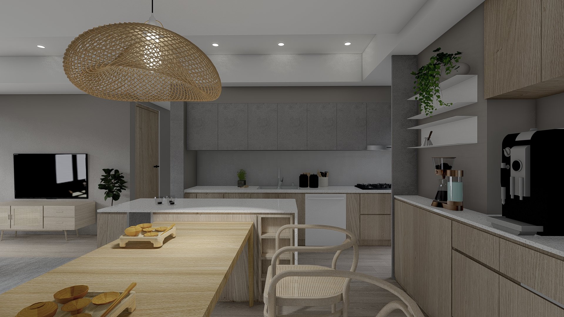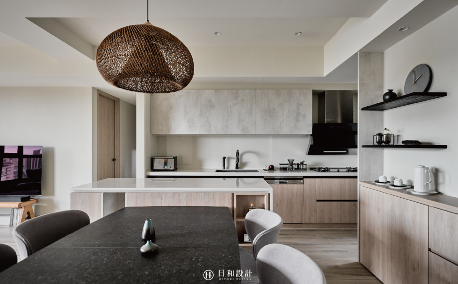 上方懸掛的吊燈以天然藤編點綴,光線透過編織紋理輕柔漫散,投下溫暖而富有層次的光影,使日常的用餐時光更添質感與情調。