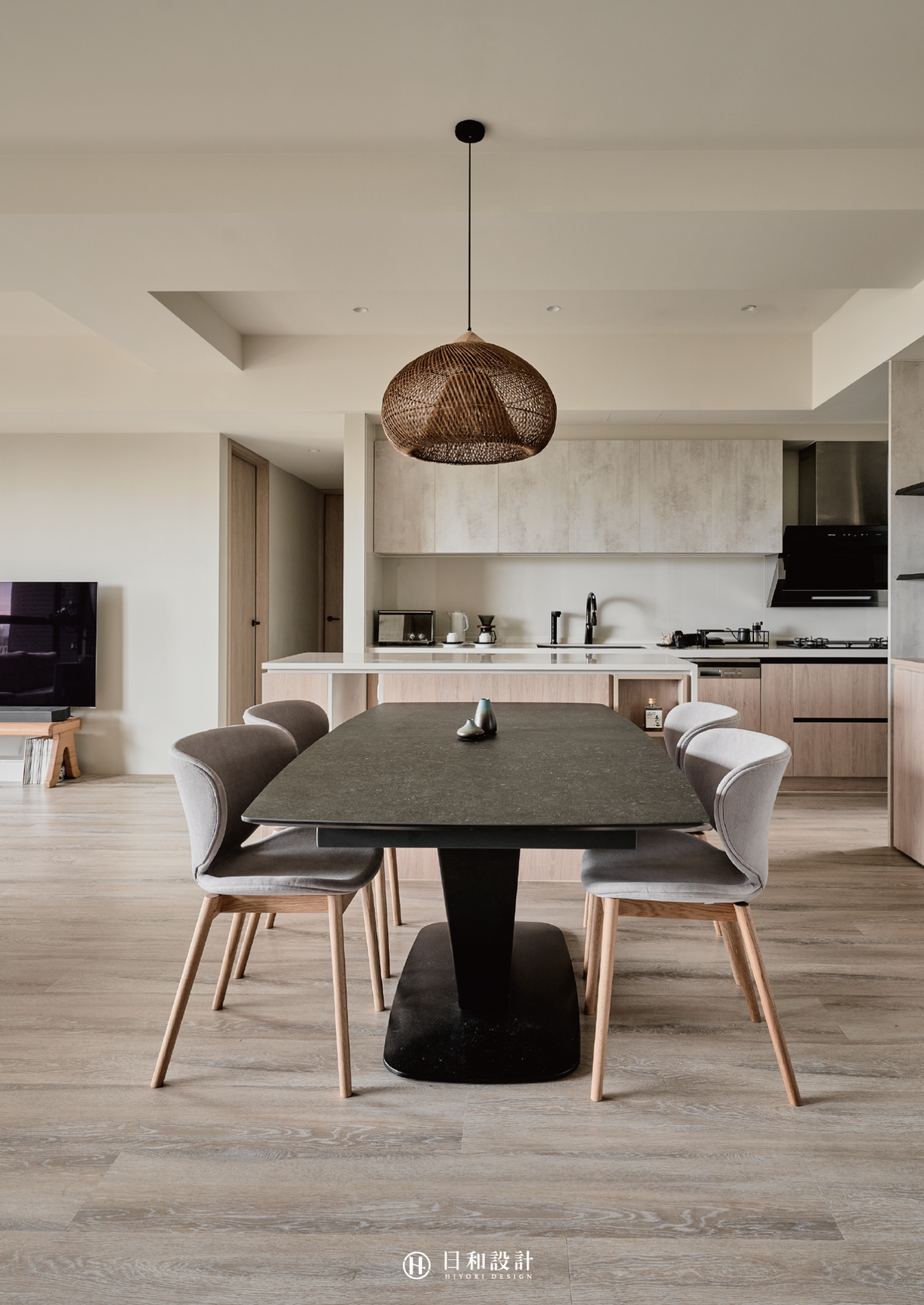 開放式餐廳與廚房相連,深色石質餐桌與溫潤木質餐椅相互平衡,營造沉穩而溫馨的用餐氛圍,為整體空間注入一絲安定。