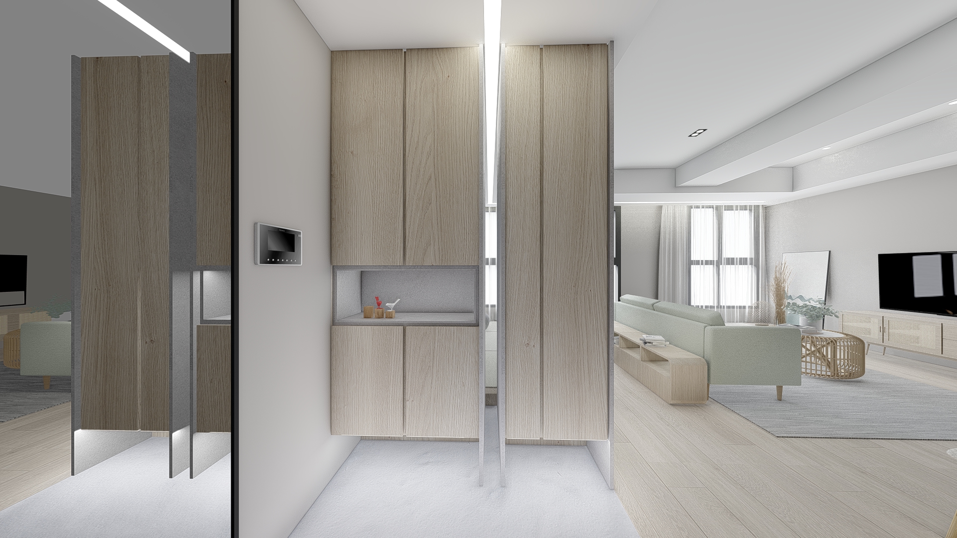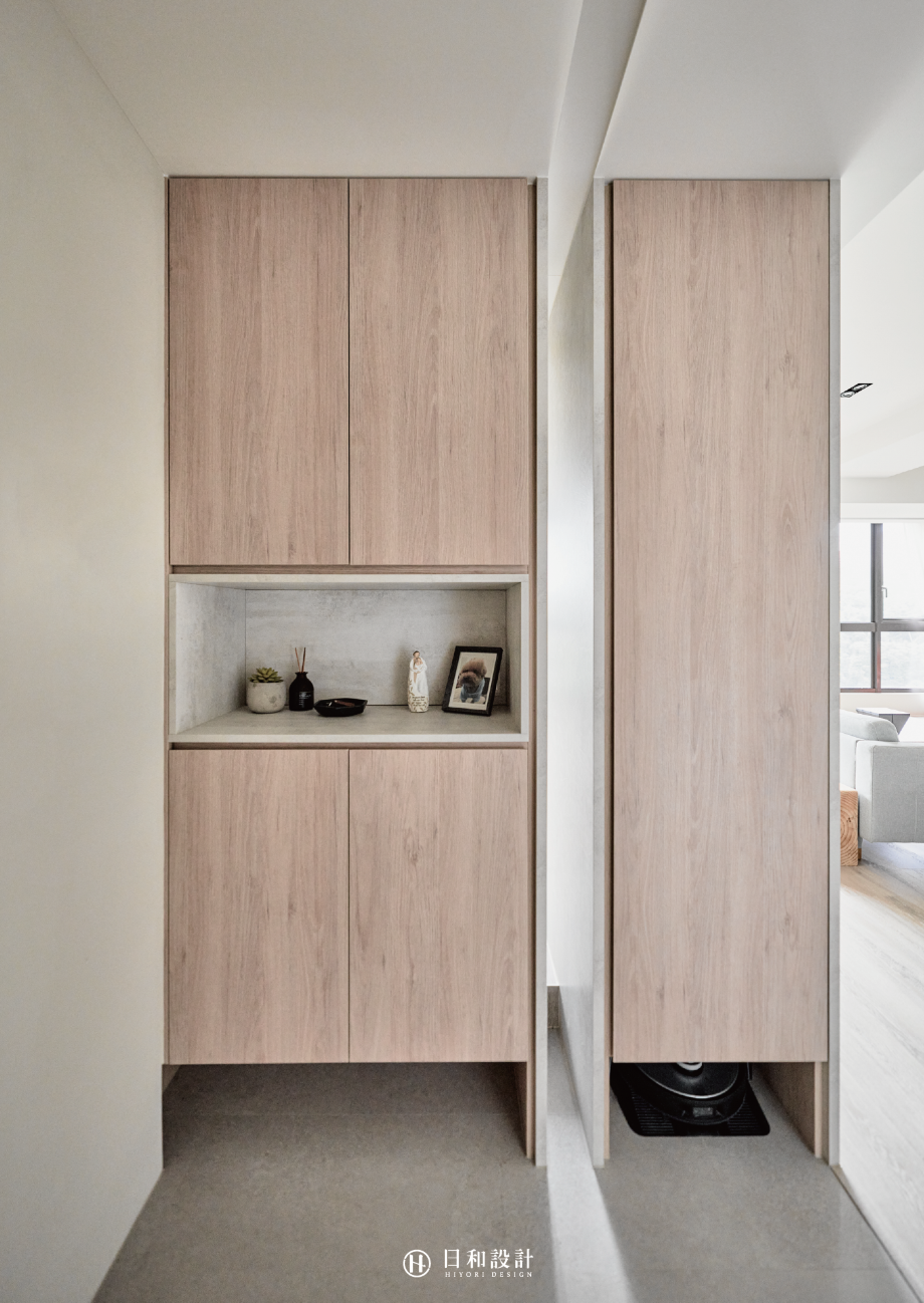 在這處設計中,木質櫃體作為隔擋,巧妙地融合了風水與實用性,其溫潤質感與自然紋理為空間注入一份舒適與平和,彷彿在踏入家門的瞬間,外界的緊張與壓力便悄然消散。