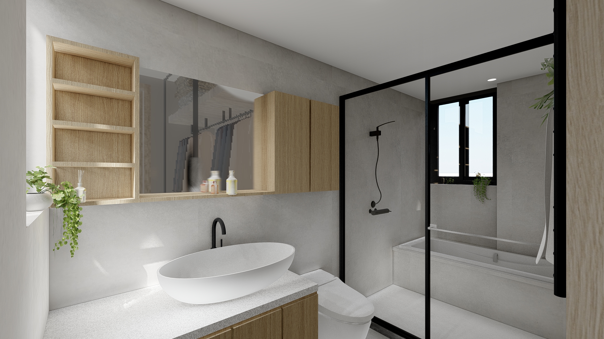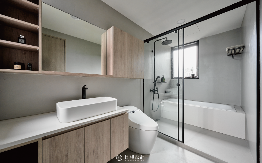 衛浴空間以溫潤的木質與低飽和色調的塗料鋪陳,營造出柔和而舒適的氛圍,讓身心在此獲得完全的釋放與療癒。