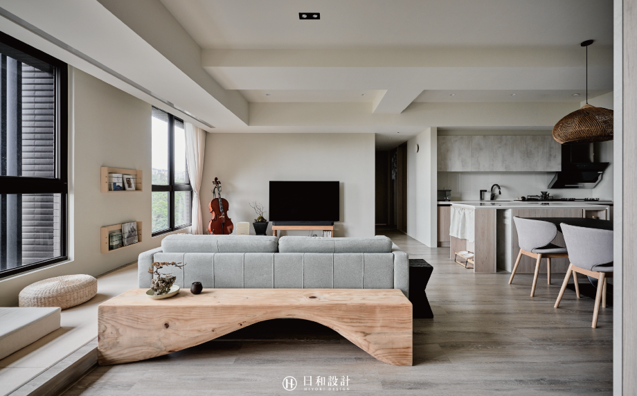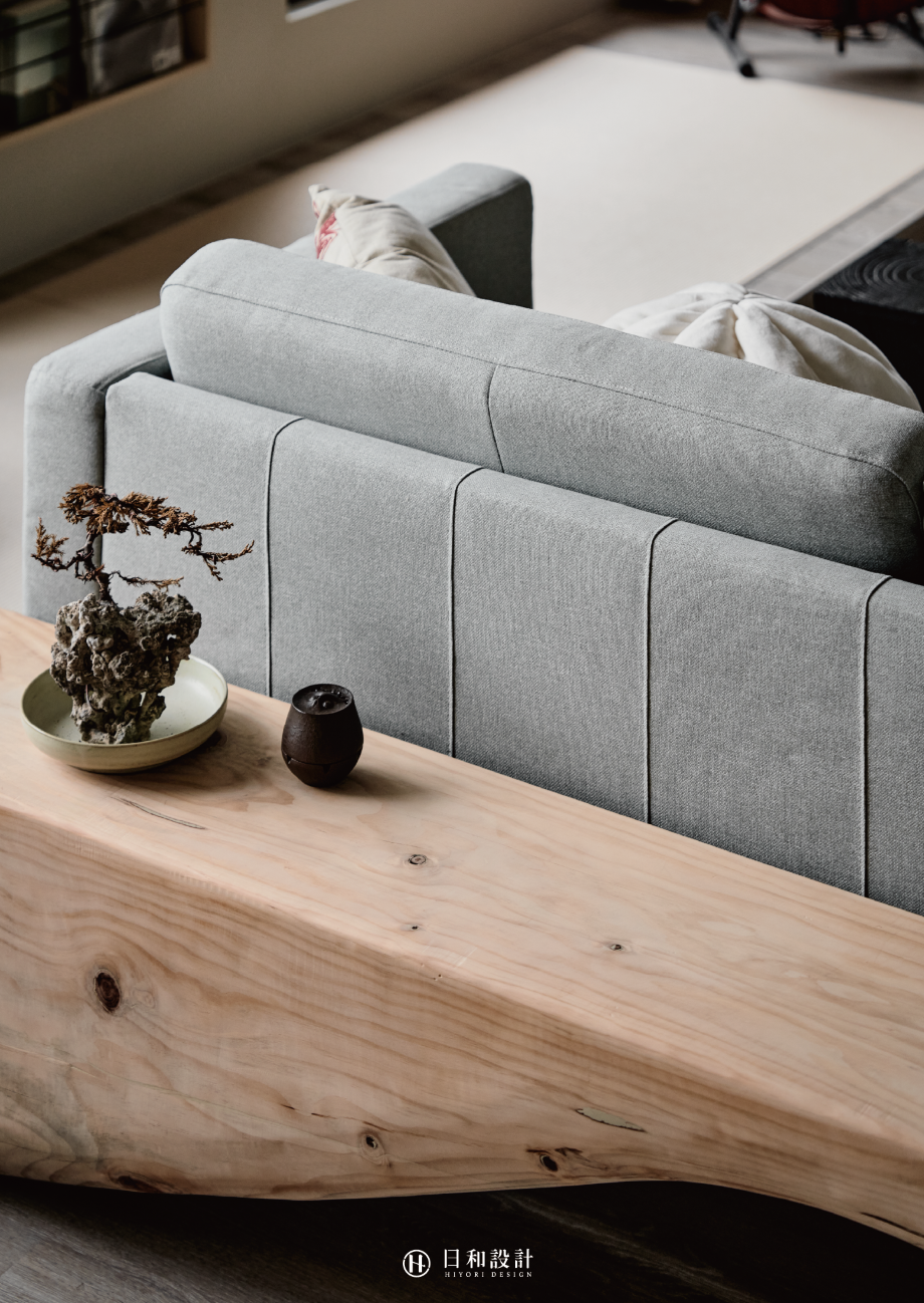 柔灰色的布製沙發,輕柔地圍塑出一處隨性而親和的交流場域,搭配一張紋理獨特的原木茶几,彷彿大地的肌理在指尖蔓延,為空間注入溫潤而自然的質感。