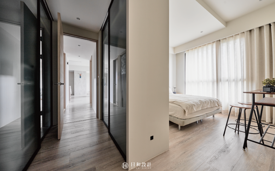 臥室延續自然的設計語彙,選用淺色木地板與米色的單品,營造柔和的休憩氛圍。大片窗戶搭配輕透紗簾,使晨光輕灑床沿,喚醒舒適的一天。